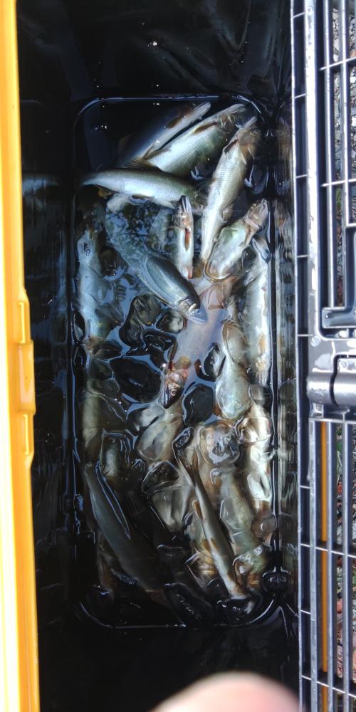 本日も白石でした 午前中20匹 午後12匹 朝だけ瀬で掛かる 昼前から水温が上がって 深トロの泳がせに反応 今回はサイズが揃った 弱った鮎は都度クーラーに チビは2匹だけ 来週は漁協の大会 枯れ木も山の賑わい(笑)で