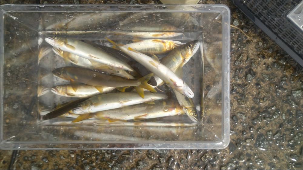 最初金谷大橋下手に入るも小型鮎2匹のみで移動し、田殿橋上手の瀬に入る。この瀬は貸し切り状態で良型の鮎の引きを楽しみました。