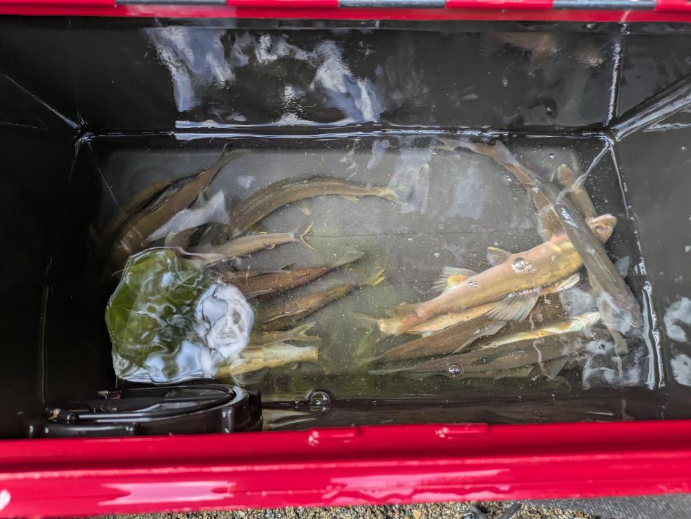 今回金曜日だったので人が少なく、佐本川でスタート。前回に比べ水位が下がり釣りやすい状態でしたが、ポイント1カ所で2連チャンでほぼ打ち止め。おとりを弱らせてしまいましたが、雨も降って水温がそれほど高くなかったので何とか持ちこたえられました。