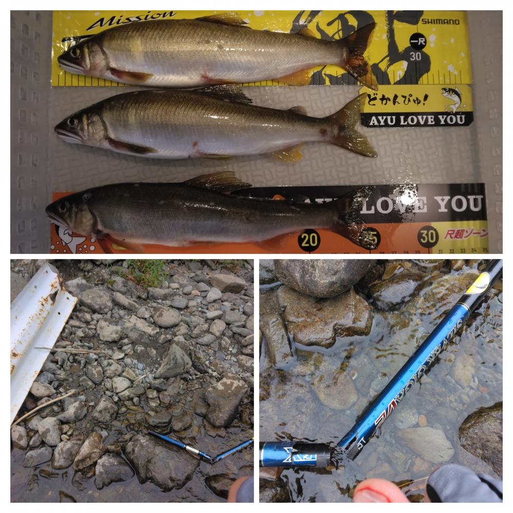 湯川と貴志川で竿出しする予定して~昼前から大鮎情報出ている湯川へ~開始30分で、やっとオトリ交換26,5ポイント移動中河原に在ったガードレールに足を引っ掛け転倒して元竿折れて気持ちも折れて貴志川へ戻る!3時過ぎから高畑へ2尾追加するが26センチ~夜勤初日に頑張って釣行したのに運の悪い釣行に成りました❗>_<転倒竿折れ❗友釣りアルアルだから仕方ないね(*_*;大きな怪我なくて良かった(≧∇≦*)