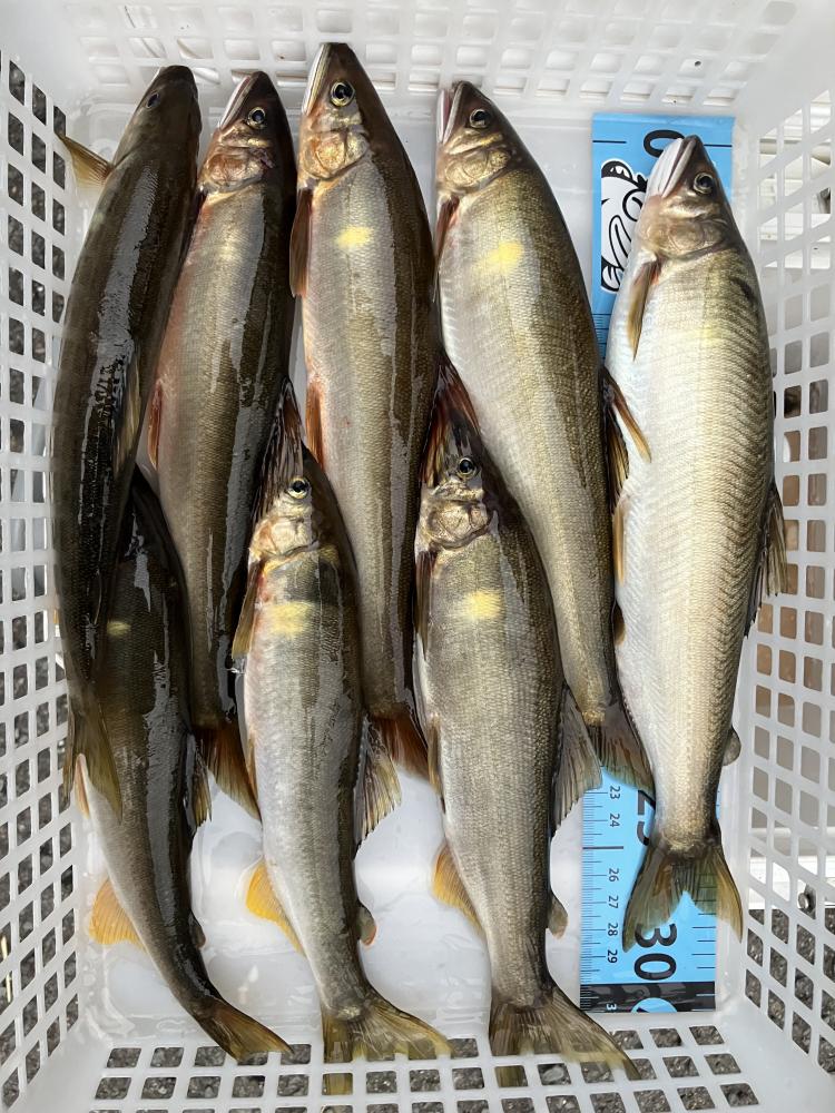 掛かる鮎がデカ過ぎて、囮に使えないので養殖再三使いたくりでした!竿8.7 ライン複合0.07 針ダブ蝶7号