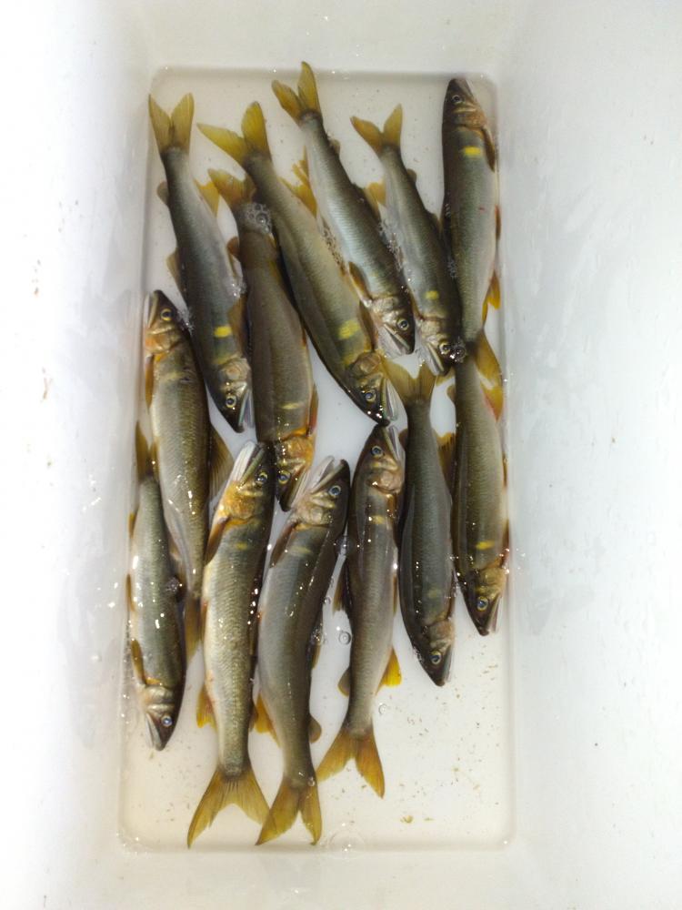 風に耐えきれず2時間で終了。小さめの元気な若い鮎が掛かりました。