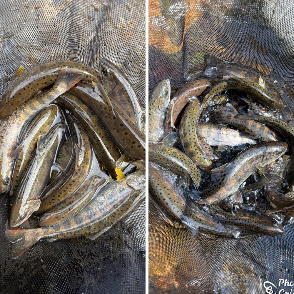 画像、左は朝イチ釣った天然物、右側は温泉で釣ったほぼ成魚デス
