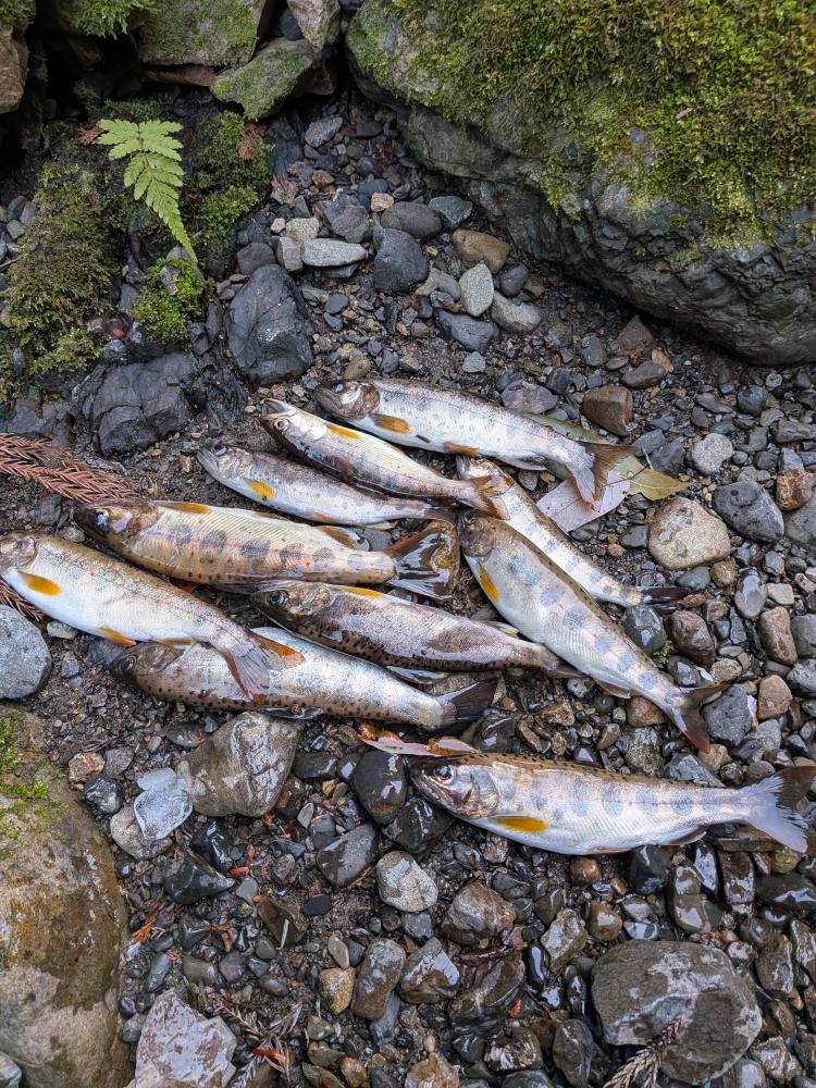 渇水。本流は数は少ないけど肥えたアマゴが釣れた。支流は水が減ったせいかアマゴの顔を見るのに苦労した。餌はミミズ。