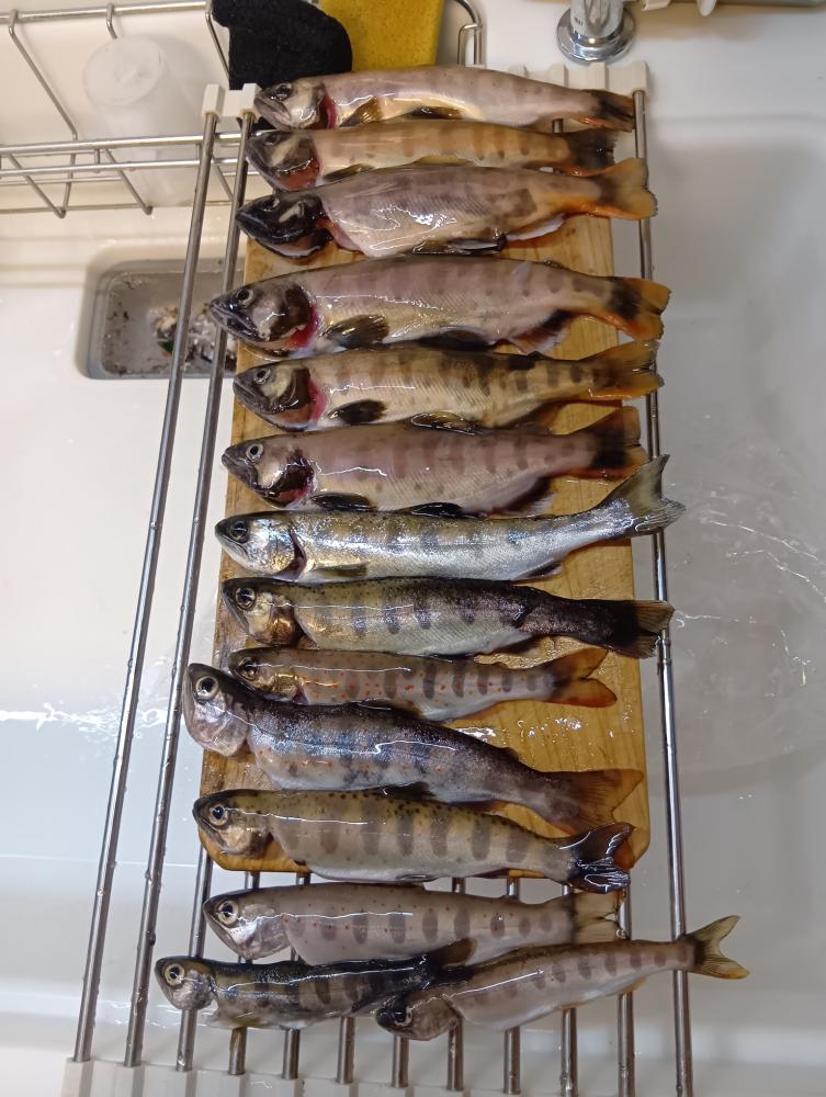 水位平水 半分以上放流もの しかも痩せている。ひれピン来たらうれしい ちびアマゴ2匹 残念ながら針飲み込みリリース不可でした