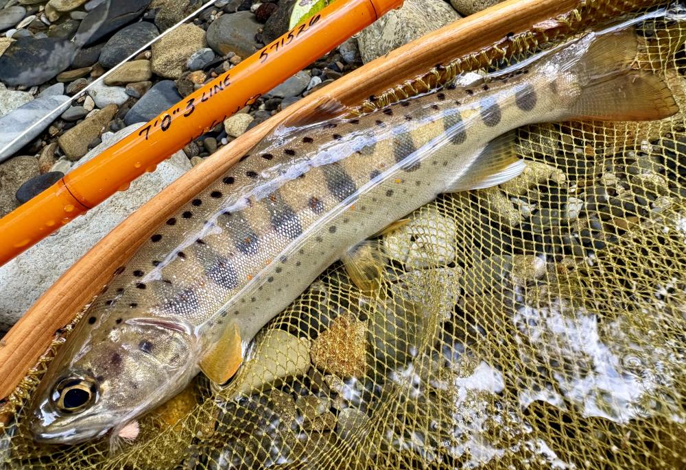 フライフィッシングで終始ドライフライで釣りました。少し水が多かったせいか微妙にドラグがかかって、フライに出てもフッキングしなかったり、かけてもすぐバレたりしながらも、色々工夫しながら楽しんで釣りました!バーブレスフックを使用して、釣れた魚はすべてリリースしました。