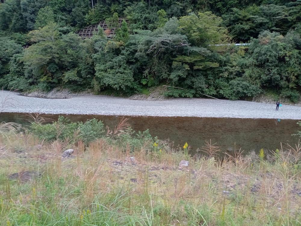 あちこちに網漁の笹立てがあり、渇水で難しい。