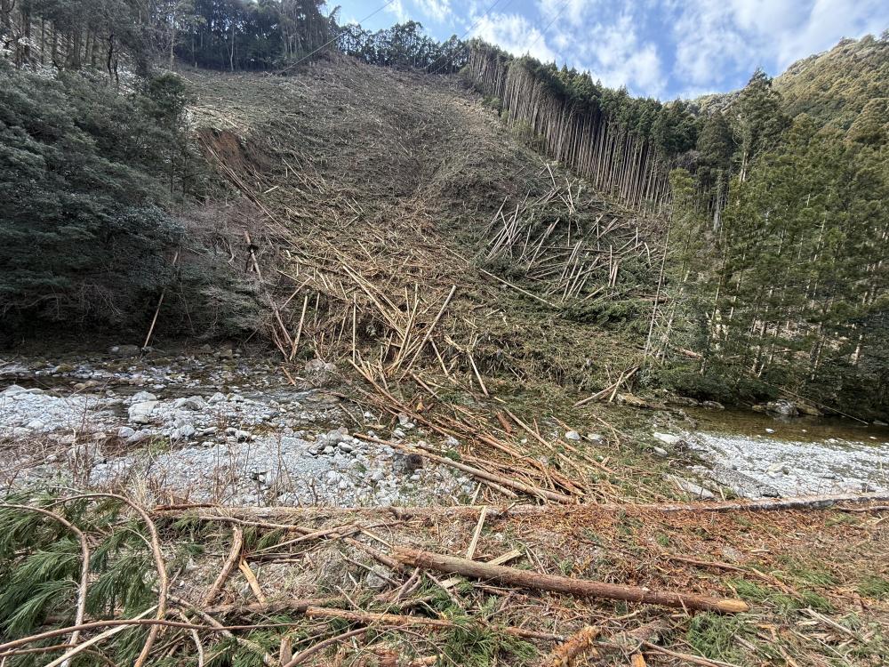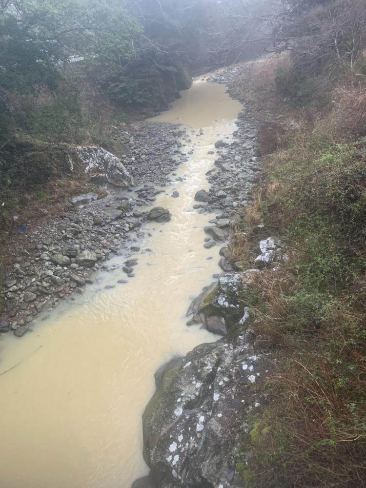 同じく、平井地区・大原平橋上流で起きた大規模な崩落現場で行われている災害復旧工事。僅かな降雨でも山肌の土砂が流れ出る為に酷い濁りが発生します。いずれも、当該区や漁協から県や業者への要望は行われていますが、何の変化もありません。